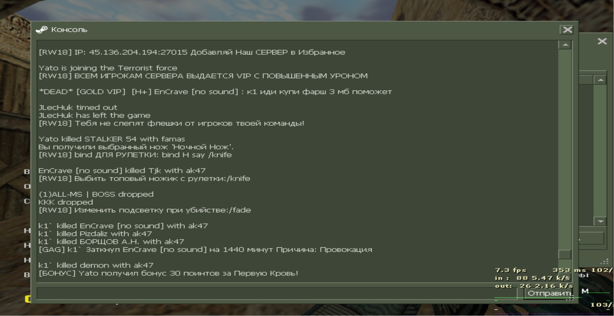 Сразу на троих будет. Игрок (absolutely infallible*) который играет с читом но администрация либо не замечает либо не хочет замечать. Чисто случайно на него попал, на карте трейн спалился 15:59, смотрел в одну точку, как только увидел модельку сделал рывок прицела мимо модельки два раза по 81/81 в первом и во втором случае. 16:22 я это указываю в оскорбительной форме, после чего получаю гаг от Vra4 который вместо того чтобы предупредить что нельзя оскорблять даёт гаг, в следствие этот игрок выходит 16:28 в табе видно что его уже и след пропал и он после этого сразу перезаходит в следующем раунде в 16:50